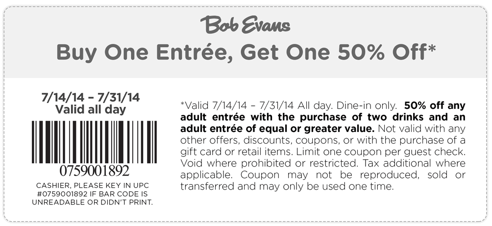 Bob Evans Coupons - Printable Coupons and Deals Check out this new Printable Coupon for Bob Evans! Now through 8/13, Buy one breakfast entree and get another 50% off when you buy two drinks! Choose your breakfast from the folllowing categories: Farm Fresh Egg Combinations, Stuffed 3-Egg Omelets, Hot off the Griddle, and Sweet & Stacked Hotcakes menu sections.